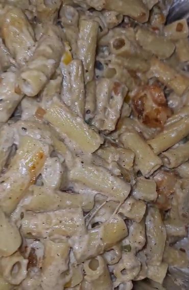 Pasta with shrimp, peppers, onions in jerk Alfredo sauce.